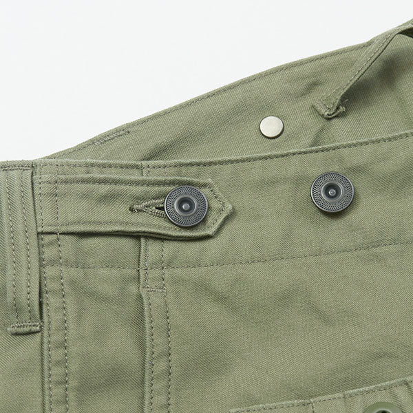 ウエストのボタンによるアジャスターや、サスペンダーボタンの付属、右前腰のマチ付ポケット、カーゴポケットに収納可能なドローコードなどディテールにも注目して頂きたい逸品です。