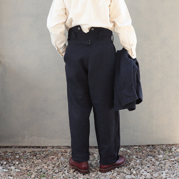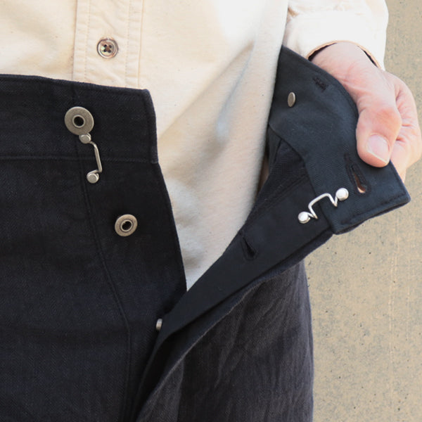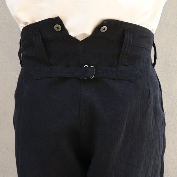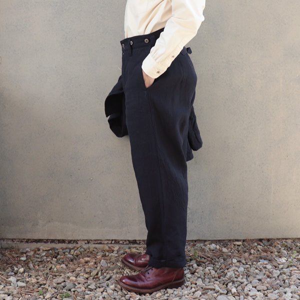 ■ヴィンテージのワークパンツによく見られるバックポケットの付かないデザイン、シンチバック、ウエスト内側に配されたサスペンダーボタンが特徴です。