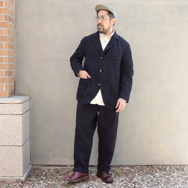 着込むことで風合いが増すヘリンボーン織の表情と、リネンやヘンプのドライタッチな質感を兼ね備えた、唯一無二の生地をお楽しみ下さい。