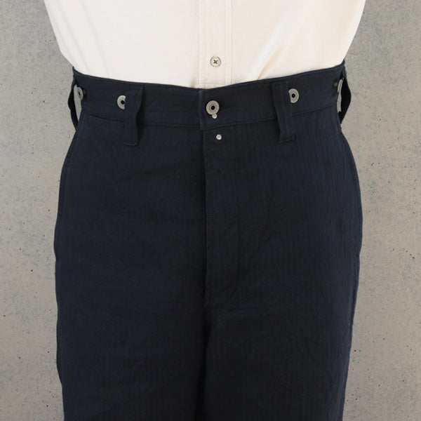 ■素材は、ヘンプとリネントップの糸を撚り合わせた双糸で、インディゴ染と硫化染を駆使して織り上げたブランド・オリジナルのヘリンボーン織の生地を使用しています。