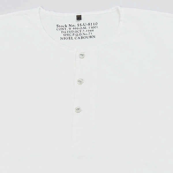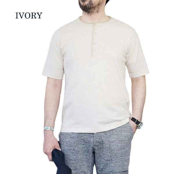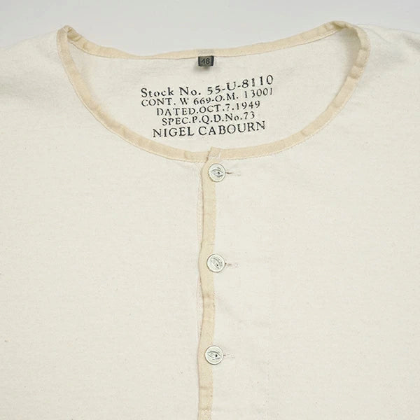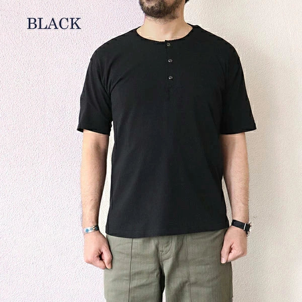 1950年代のヴィンテージのヘンリーネックTシャツをベースにしたTシャツです。脇に縫い目のない丸胴と呼ばれる仕様で、縫い目が素肌に当たらずストレスフリーです。