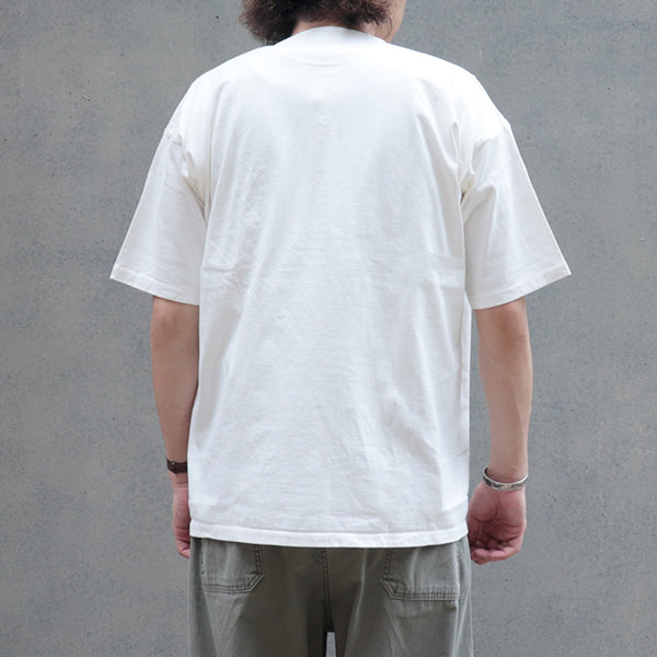 オープンエンドヤーン(空紡糸)を原料とした丸胴の編地、ナイジェル・ケーボンの定番Tシャツではおなじみのボディから編地の密度を変更し、7.8ozに仕上げました。これまでナイジェル・ケーボンのTシャツは5.6ozと9.5ozがありますので、ちょうどその中間くらいの厚さの生地です。