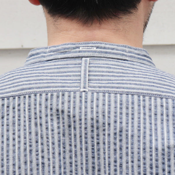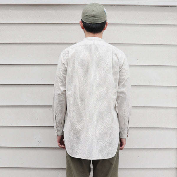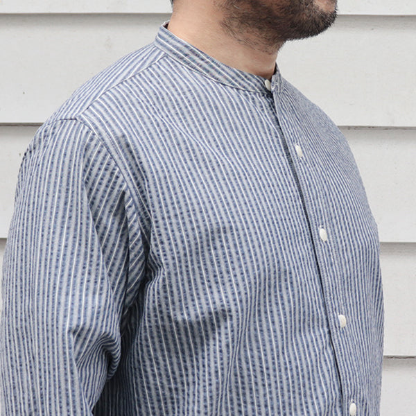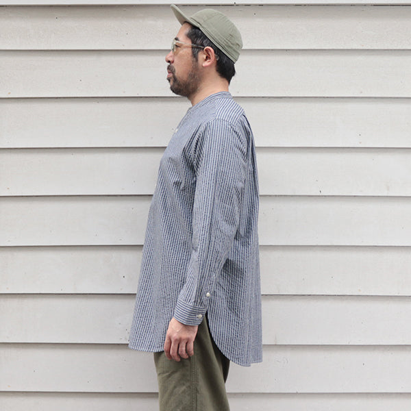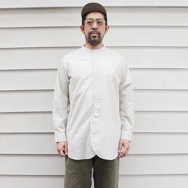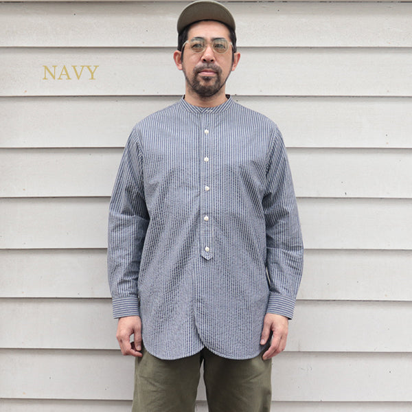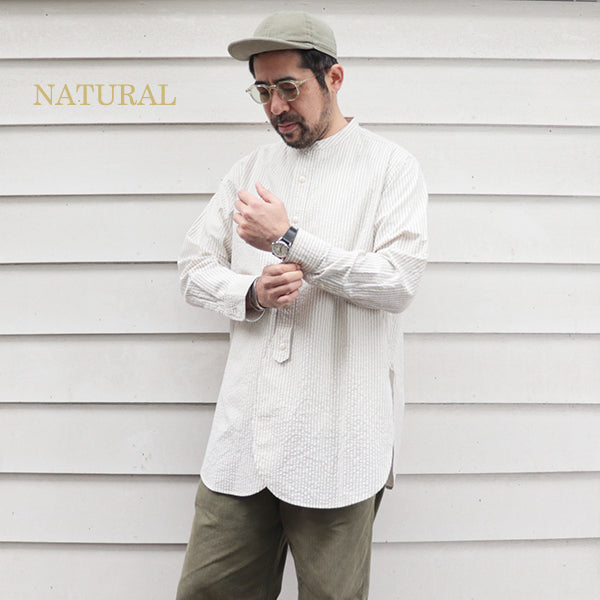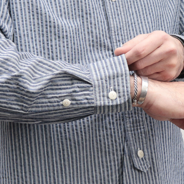 ■素材は、コットンのシアサッカー素材を使用しています。シアサッカーは、生地表面に凹凸のしぼがストライプ状に現れる様に織られた生地の種類です。平坦な生地よりも肌への接触面が少ないため、通気性がありべたつきにくく春夏向けの生地としてよく使用される生地で、サラリとした清涼感のある着心地が特徴です。
