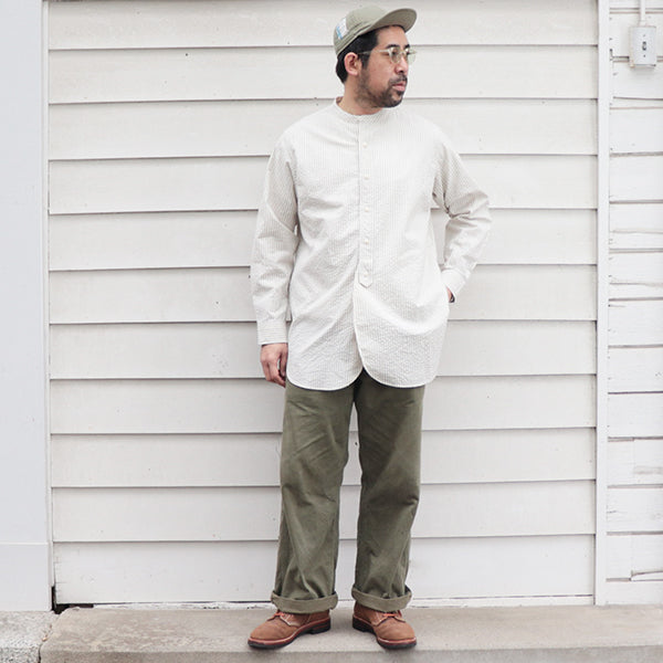 ■バンドカラーの襟、着丈の長さ、前見頃のデザイン(裾あおり留め隠しボタン)、裾のサイドピースなどは1900年代初頭のディテールをアレンジし、出来るだけ古着のリメイクに見えないよう全体のサイズバランスとシルエットに拘り制作されています。また、バンドカラーの襟は、着用時に当時を想わせるように立ち上がらないようなデザインしています。