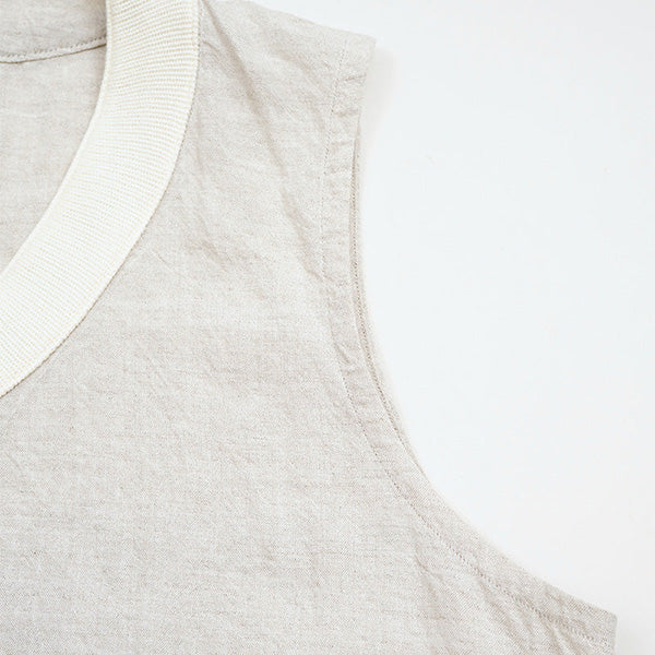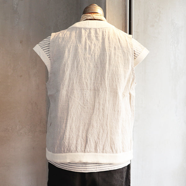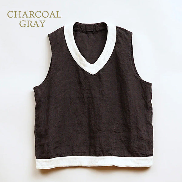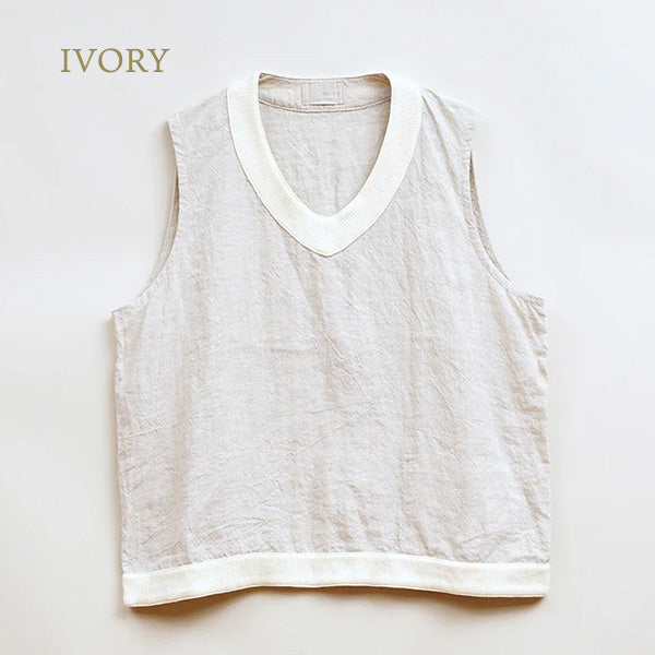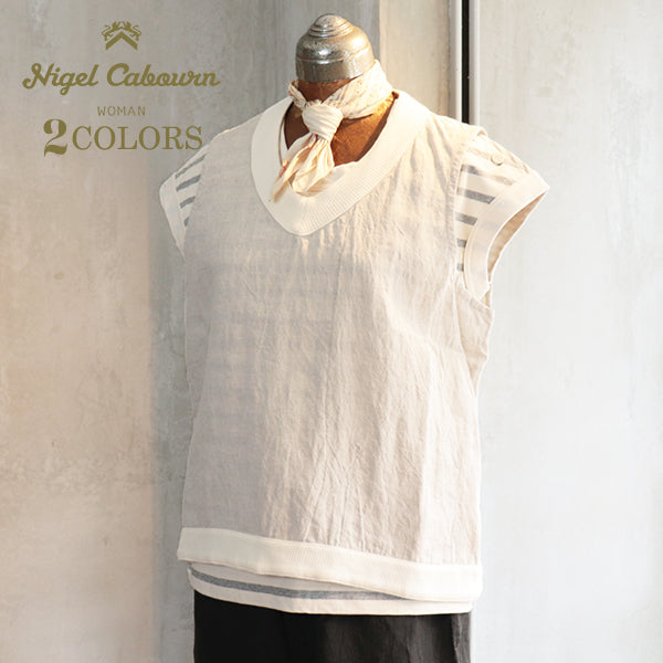 ナイジェル・ケーボン ウーマンの2025年ハイサマーコレクションより、クリケットベストをベースにしたデザインにリネン素材を使用したプルオーバーベストがリリース。