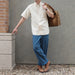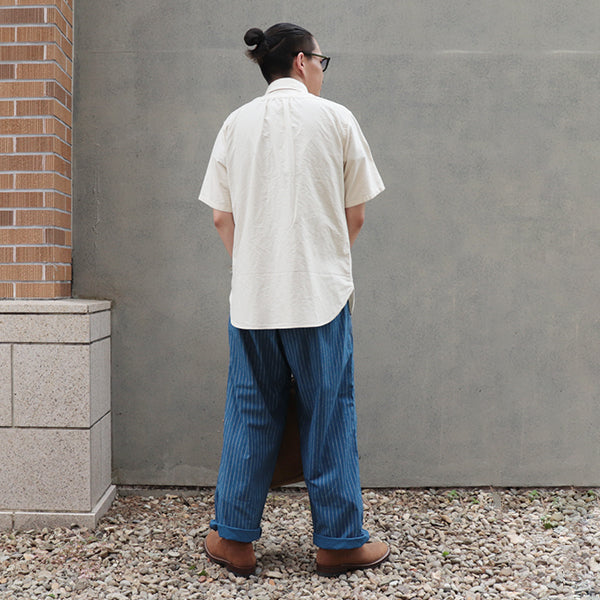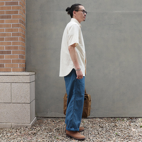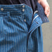 ウォバッシュストライプは、ワークウェアに見られる特徴的な柄で、インディゴ染めの生地に白いドットやストライプが並ぶデザインです。プリントではなく、抜染(ばっせん)と呼ばれる染料を抜く技法で模様を浮かび上がらせており、独特の風合いと味わい深い表情が楽しめます。