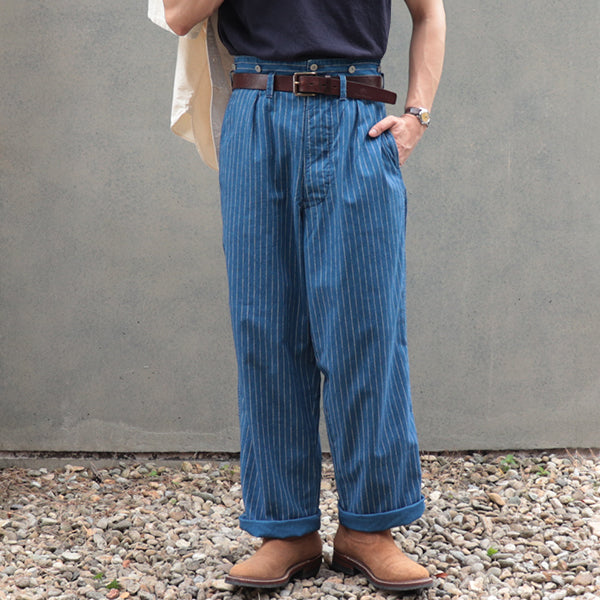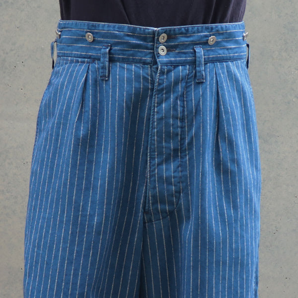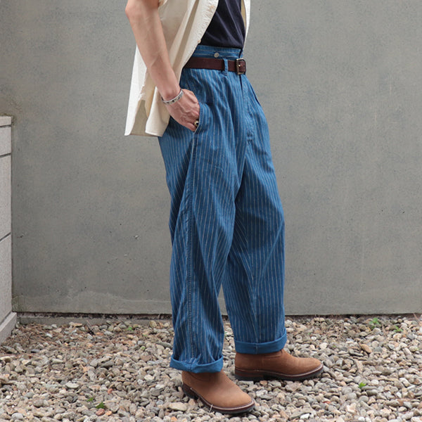 ナイジェル・ケーボン 2025年ハイサマーコレクションより、ヴィンテージのフレンチワークパンツをベースにしたデザインに、抜染によるウォバッシュストライプ柄が施された生地を使用したモデルがリリース。