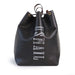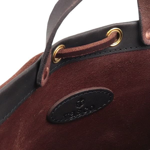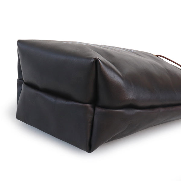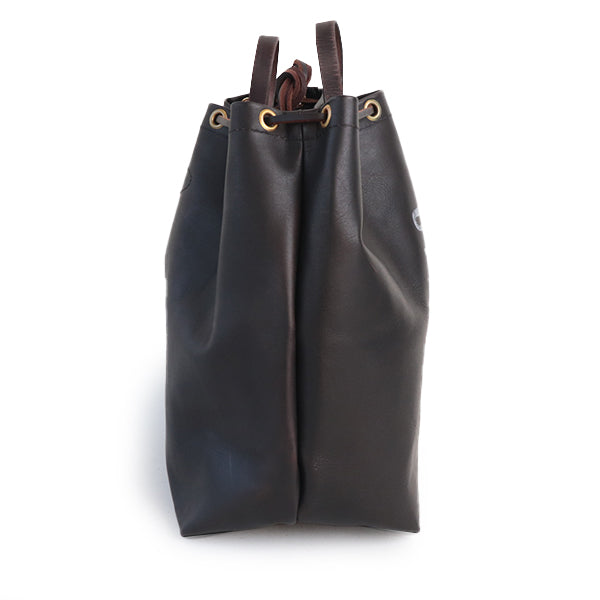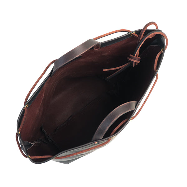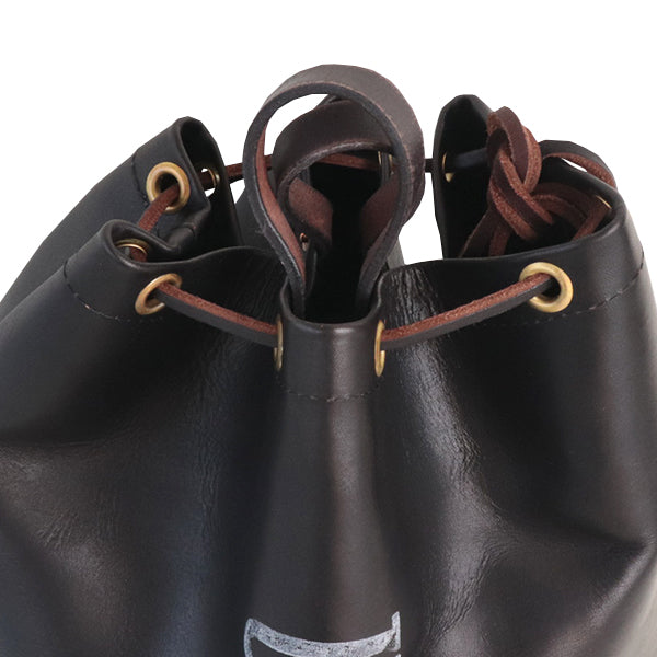 ◎革ひもを片面だけ絞り、肩掛けする巾着ショルダースタイル