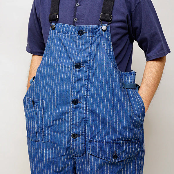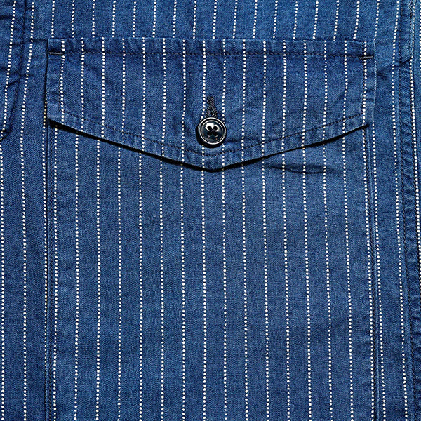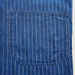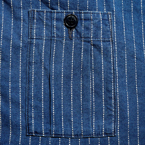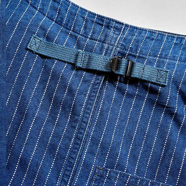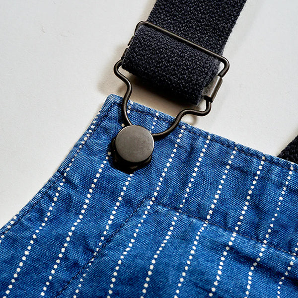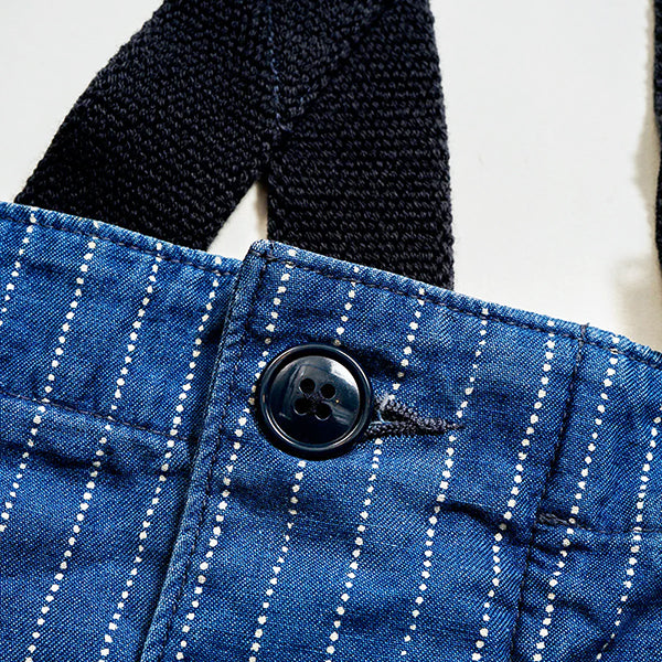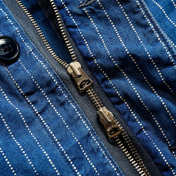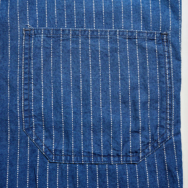 ウォバッシュストライプは、ワークウェアに見られる特徴的な柄で、インディゴ染めの生地に白いドットやストライプが並ぶデザインです。プリントではなく、抜染(ばっせん)と呼ばれる染料を抜く技法で模様を浮かび上がらせており、独特の風合いと味わい深い表情が楽しめます。