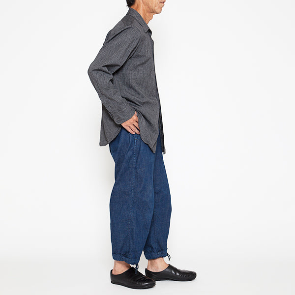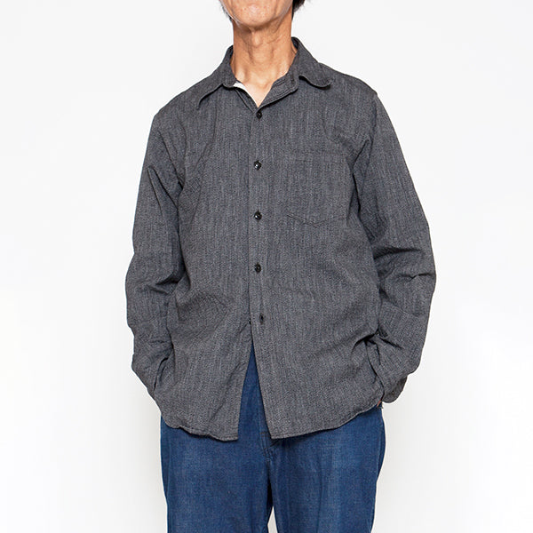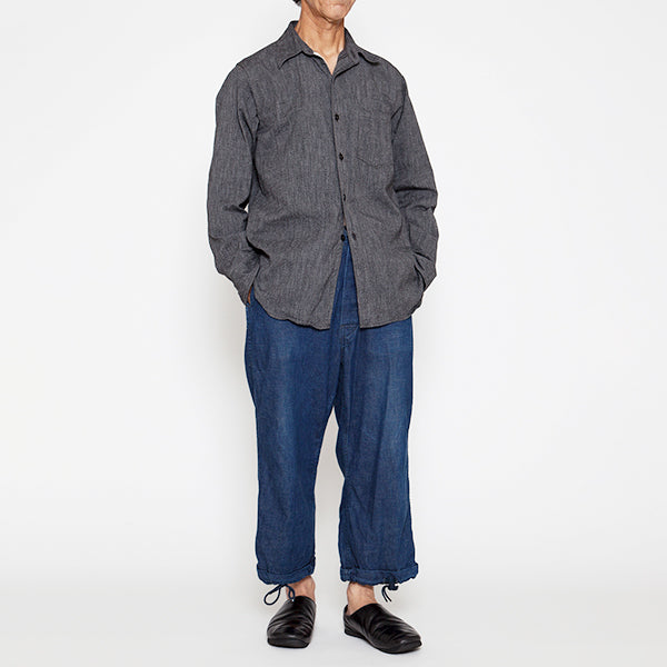 ■素材は、ヴィンテージワークシャツに使われていた5oz杢シャンブレーをリプロダクションした生地を使用しています 。撚り杢とは、異なるカラーの糸を撚り合わせた糸で織った生地で、霜降りがかった表情豊かな素材感が特徴です。トップブラックのシャツ生地で、ブルーシャンブレーとは違う落ち着いたクラシックな雰囲気の生地です。