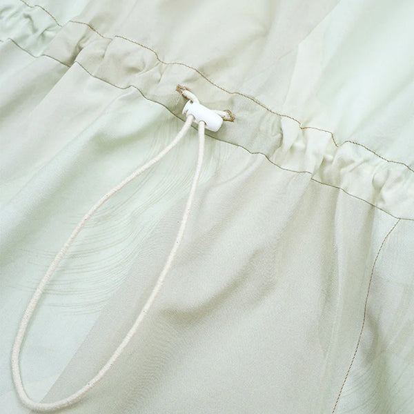■襟元とウエストに配したドローコードでシルエットの調整が可能です。そのまま着ても、絞ってニュアンスをつけても一枚で着映えするデザインです。
