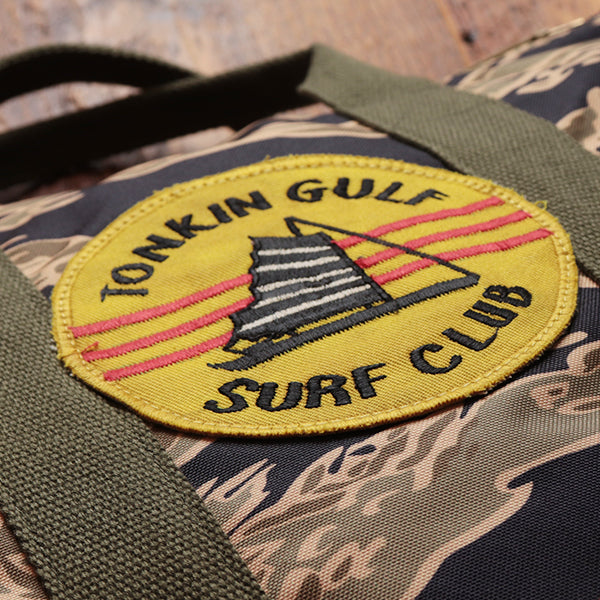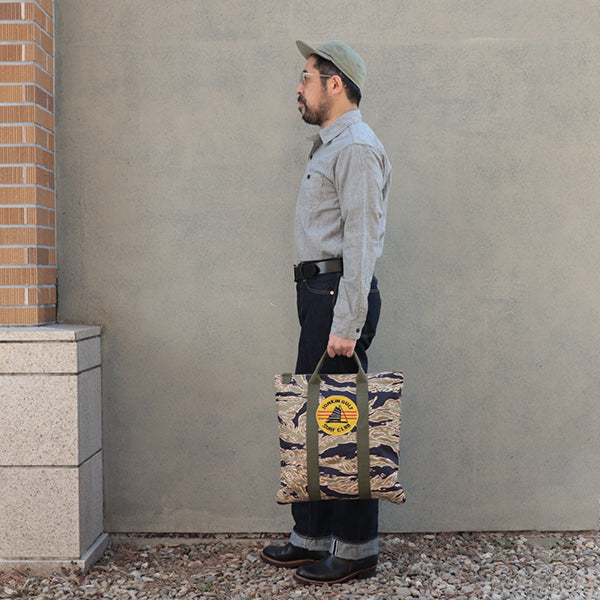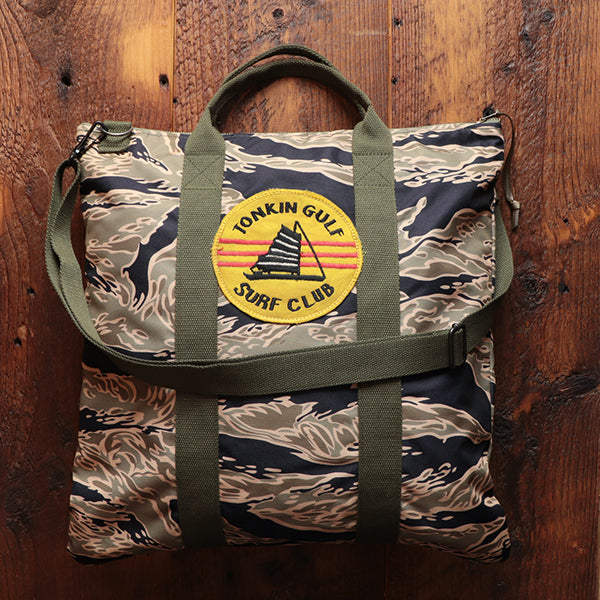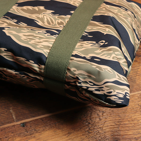 ■素材は、しっかりとした厚さのタイガーカモ柄のナイロン素材を使用しています。軽量で耐久性が高く、撥水性を備えた素材です。