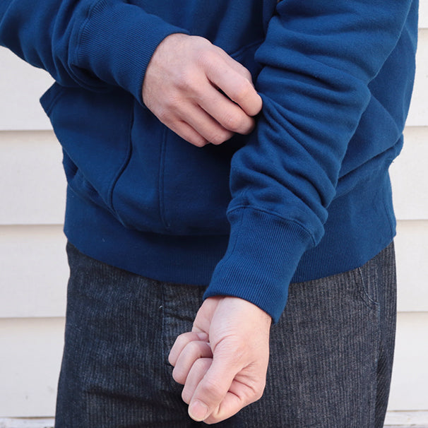リブ仕様の袖口とウエストバンドは暖かさを逃さず、2つのフロントポケットとスリムな5mmの日本製のドローコードは、1940年代の名作スウェットパーカーへのオマージュとして機能的にデザインされています。