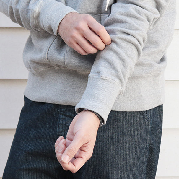 リブ仕様の袖口とウエストバンドは暖かさを逃さず、2つのフロントポケットとスリムな5mmの日本製のドローコードは、1940年代の名作スウェットパーカーへのオマージュとして機能的にデザインされています。